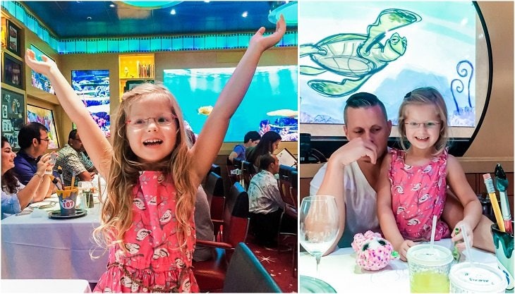 THAT WAS AMAZING! A completely different level of dining entertainment. First of all, the wait staff was phenomenal. Attention to the adults and especially kids was unprecedented. They made towel animals and performed little tricks with them while we were waiting for food. They were so incredibly attentive to Lexi that she still talks about the magic tricks they showed her. If anyone in your party has any allergies, the chef would come out and talk to the family and see what they can make for the child. You could literally point at a Mickey mouse waffle and ask them to make one gluten free or dairy free and they would write it down and do it. It was amazing. Our favorite was dining with Crush. We had aquarium screens over our tables and Crush would swim up to each table and start talking to the people, asking them embarrassing questions. It was hilarious to watch.